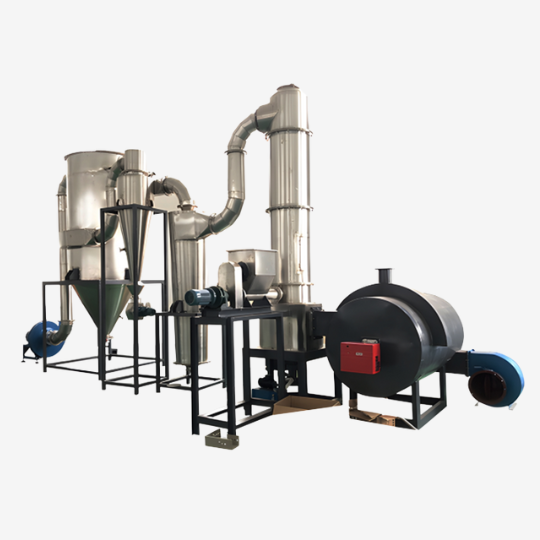 Under the high-temperature environment, your wet material will be shearing, blowing, and mixing. Then the material will be micronized under the influence of the centrifugal force. During this period, the gas phase and the solid phase will undergo the rotational flow. Because the solid phase has greater inertia than the gas phase. The relative speed between the two phases is relatively large. This will help to enhance the mass transfer and heat transfer, and then achieve a high production strength.